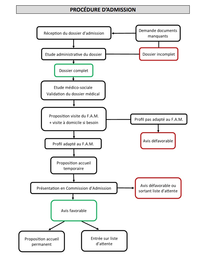 La commission interne de l’établissement composée de la Présidente d’Handivillage 33, de la Directrice de l’établissement, du médecin coordonnateur, de la Coordinatrice soins, et de l’Assistante sociale statue sur l’admissibilité du résident selon une évaluation du profil bio-psychosocial du futur résident.